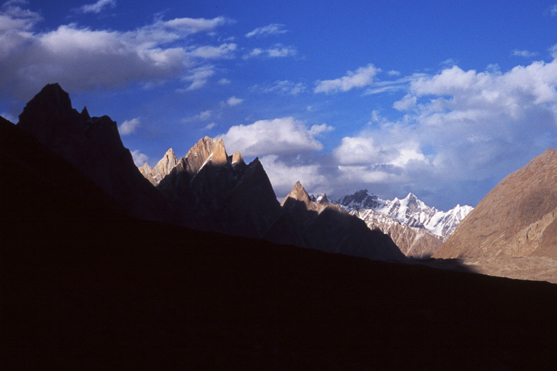 The sun sets on the Trango Towers Group along the Baltoro Glacier.